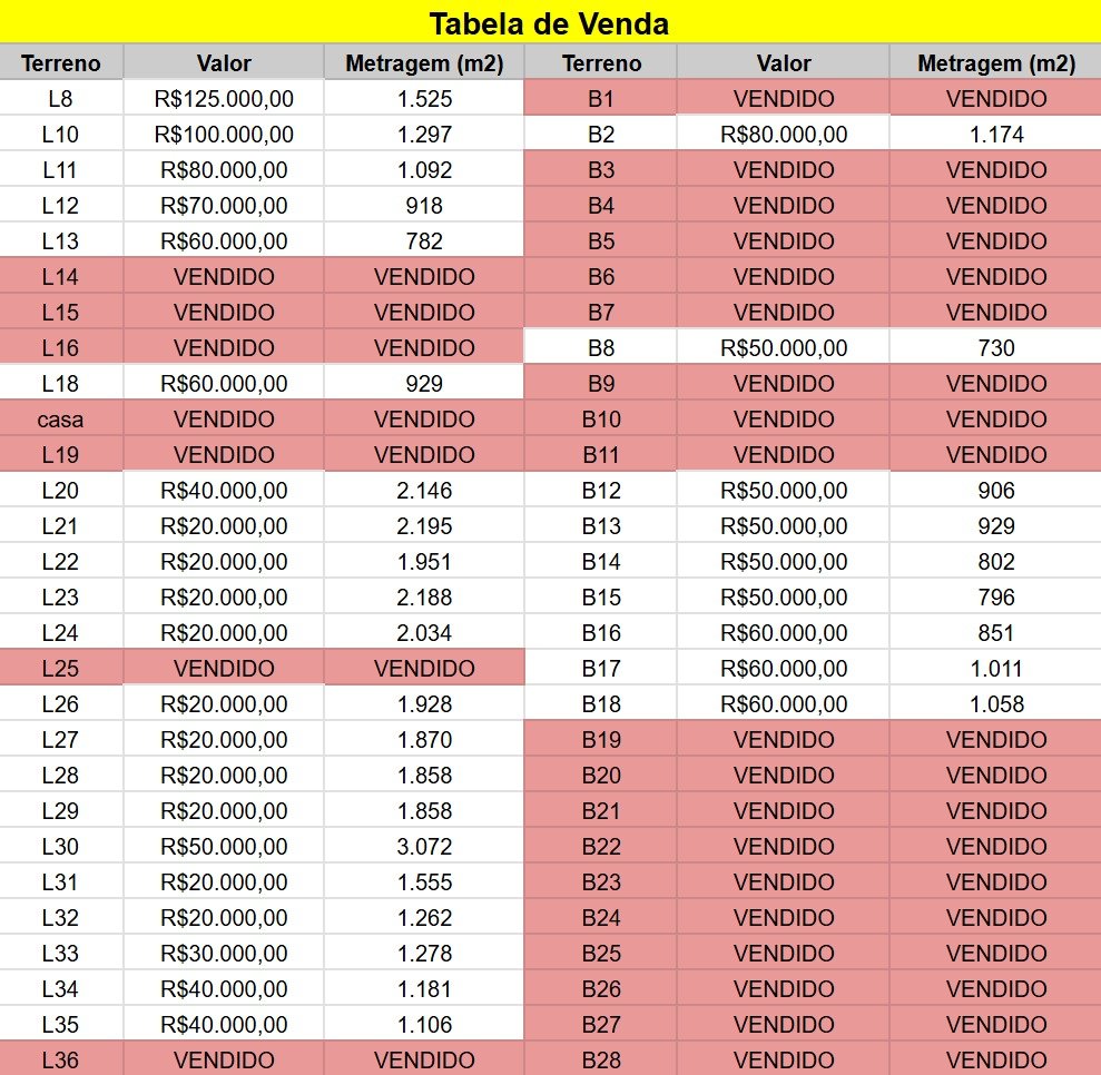 Todos os terrenos da área vão receber a infraestrutura completa de água, luz e internet fibra ótica. Hoje os terrenos que já contam com isso são o L1 até o L19, os outros contam com água de mina e ainda em 2026 terão a infraestrutura completa também.