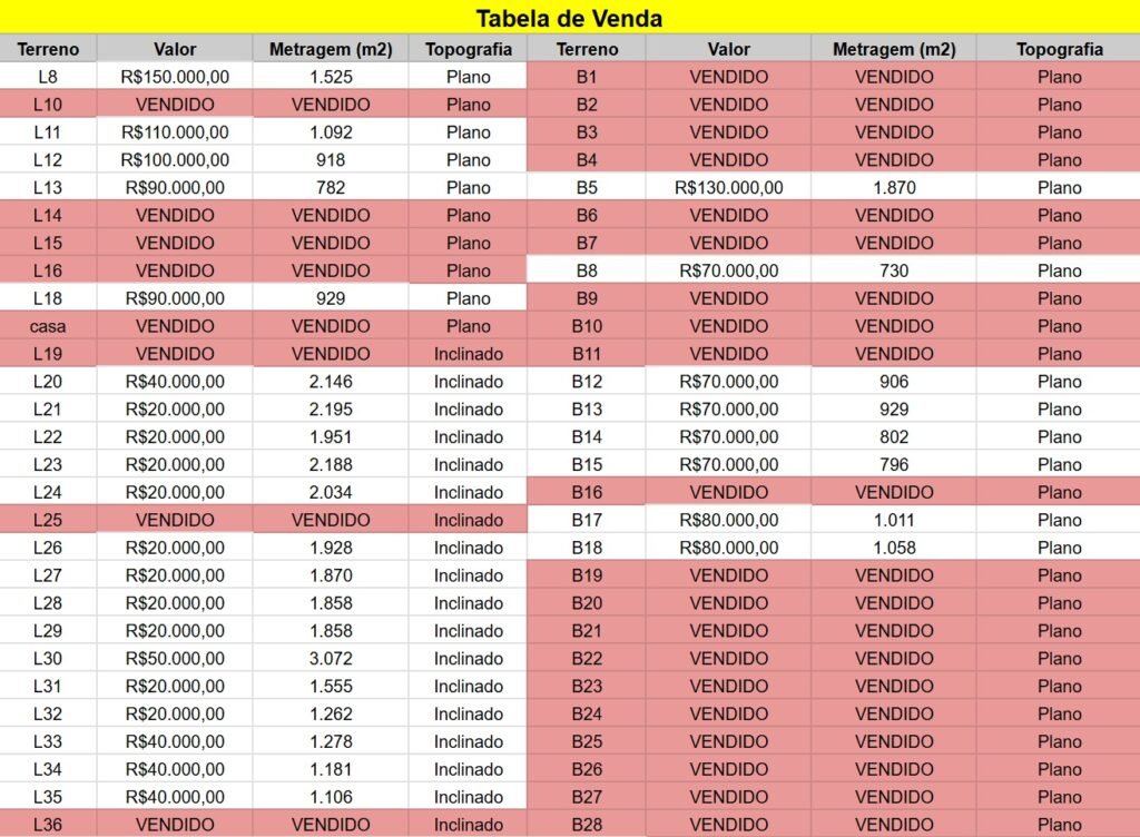 Os valores dos terrenos variam conforme a topografia e posição no loteamento, e não pela metragem — todos os lotes possuem áreas amplas.